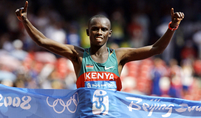 Kenya’s Samuel Kamau Wansiru crosses the finish line to win the men’s marathon, the last event of the athletics competitions finishing in the National Stadium at the Beijing 2008 Olympics in Beijing, Sunday, Aug. 24, 2008. (AP Photo/Anja Niedringhaus)
